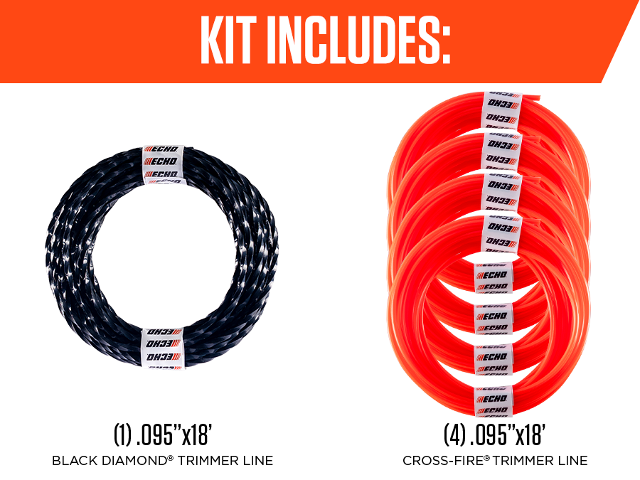 Discover the strength of ECHO's top-selling, professional-grade trimmer lines. This five-pack includes 4 loops of Cross-Fire®, featuring eight cutting edges for superior performance, and 1 loop of Black Diamond®, featuring a twisted diamond shape for fast, clean cuts, improved fuel efficiency, and reduced noise —ideal for tackling dense weeds with ease.